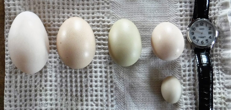 Our flock of Muscovie ducks lay large eggs which can be the equivalent in size to two large chicken eggs. The colour ranges from beige to pale olive green colour. Duck eggs keep longer than chicken eggs as their shells are much thicker. The flavour of duck eggs is similar to chicken eggs, but due to their size contain more protein, fat, calories, colesterol. Duck eggs are especially prized by bakers for the additional albumen (egg white) which makes for light and airy cakes.