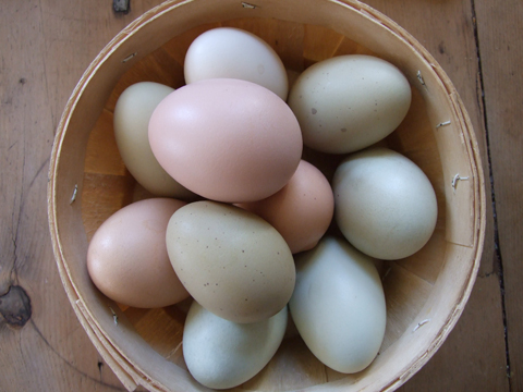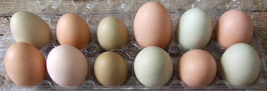 Our laying hens are a diverse and colourful flock of different breeds of chickens: Chantecler, Wyandottes, Bantam and Standard Cochins, Ameraucanas, Welsummers, Ohio Buckeyes, as well as beautiful barnyard birds from friends and neighbours. The mixed breed heritage of our flock can be seen in the variety of eggs they produce. The eggs we sell are various sizes and colours: small, medium, and large, in a rainbow of colours that range from pale beige to various hues of pink and chocolate brown, to differing shades of green and blue.