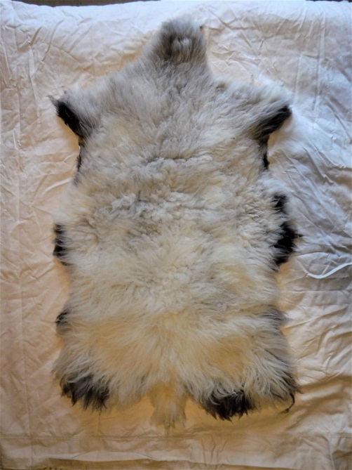 Each sheepskin is unique to the sheep that it came from. They vary in colour, density and texture; each reflecting their own breed characteristics, time of shearing, and time of harvesting. Our sheep hides are collected on the day of their slaughter. We then salt them at home and bring them for processing to Atlas Tanning and Dyes Ltd. in Blythe, Ontario. The tanning process keeps the wool on the leather and makes the hides more durable and washable. The entire tanning process takes approximately six months.